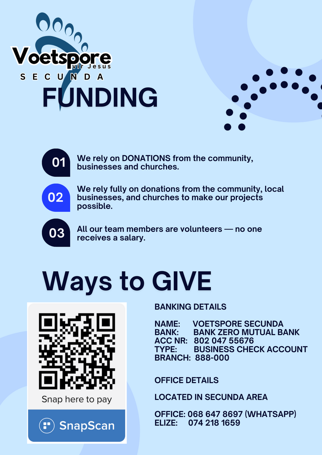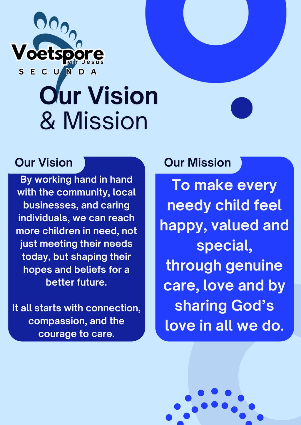 Een gesin is voltydse sendelinge wat regoor Suid-Afrika gewerk het, en die ander gesin, wat ook in die sendingveld was, het in 2023 ’n kinderbediening in Secunda begin. Saam werk ons waar God se hart klop en Sy Voetspore agterlaat