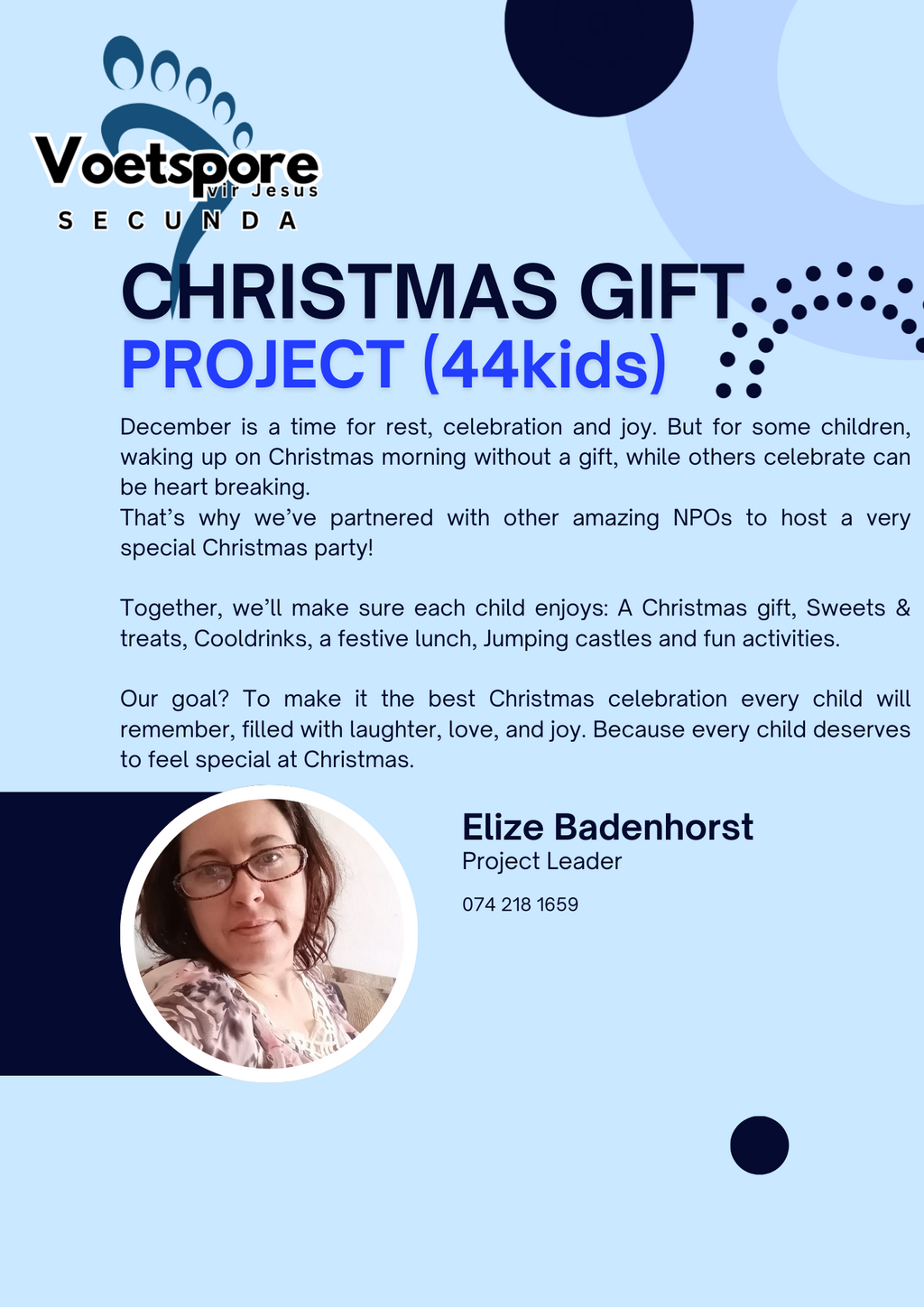 Ons gee vir elke kind 'n geleentheid om 'n brief te skryf asook om 3 geskenk idees neer te skryf. Saam met die publiek se hulp kan mense een van die geskenke kies om aan te koop. En dan gee ons dit uit op 'n kers-partytjie dag.