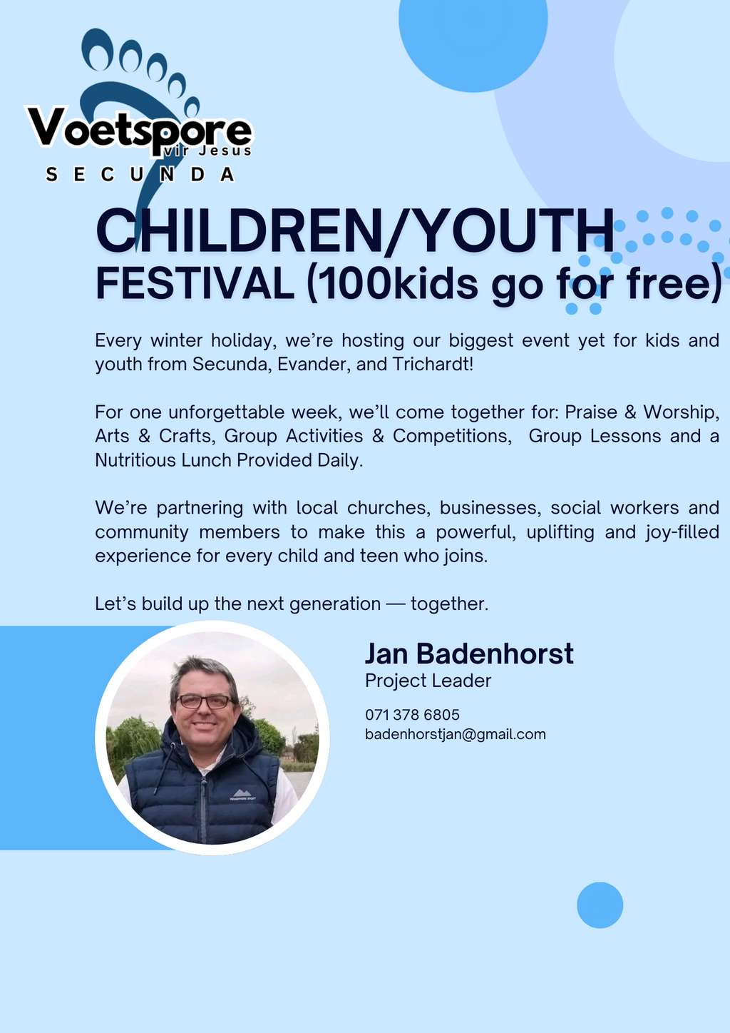 Gedurende die winter vakansie, bied ons 'n gratis JEUGFEES vir tieners aan vir 'n week. Ons kry spesiale sprekers van verskillende gemeentes af om te kom gesels oor spesifieke temas.