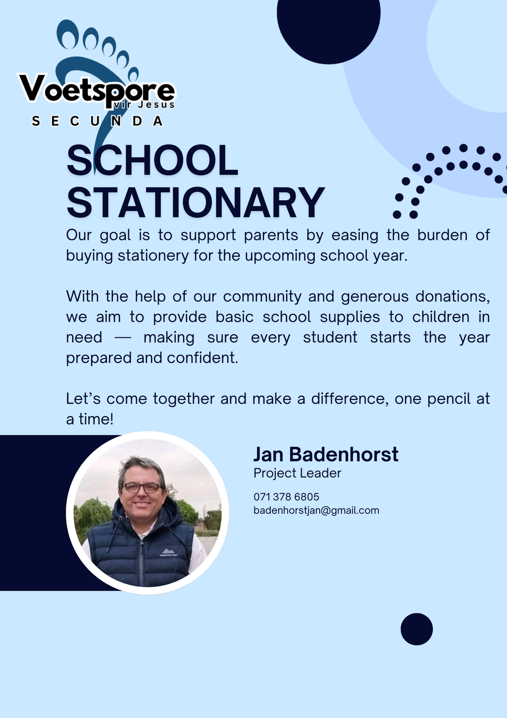 Januarie maand is gewoonlik die langste maand vir behoeftige gesinne. Om dinge bietjie makliker te maak, gee ons basiese skryfbehoeftes. Dis nogsteeds die ouers se plig om die res aan te koop.